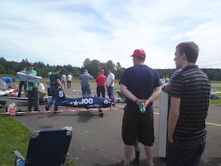 Men jag kan visa er en glimt från en modellflygsuppvisning som min ene son och jag var och såg på idag. Sonen, det är han till höger i bild i randig tröja.