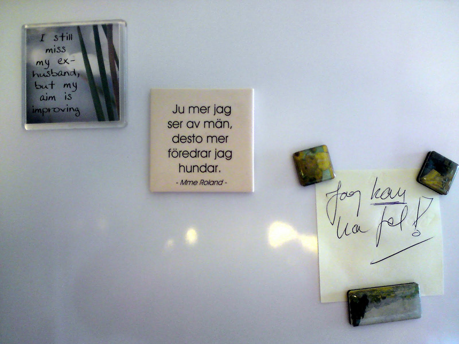 Om ni inte kan läsa vad som står på den längst bort: I still miss my ex-husband, but my aim is improving.