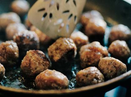 Lisa skakar på huvudet samtidigt som hon stoppar in en hel köttbulle i munnen.