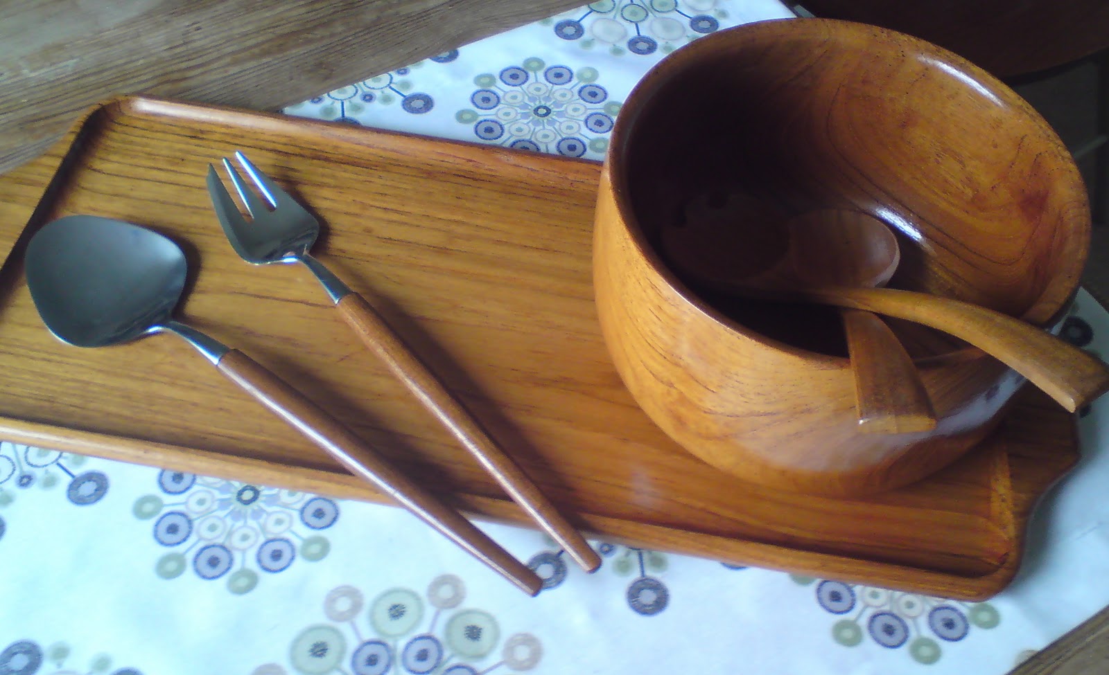 Moster Karins gamla salladsskål i teak, med dom vackra besticken.