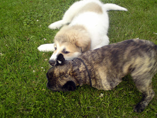 Det här är en av Sigges kompisar här på gården. Han heter Texas och är än så länge bara en liten valp. Dom båda har lekt och busat här ute under kvällen och nu sover Sigge djupt ZZZZ