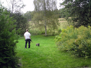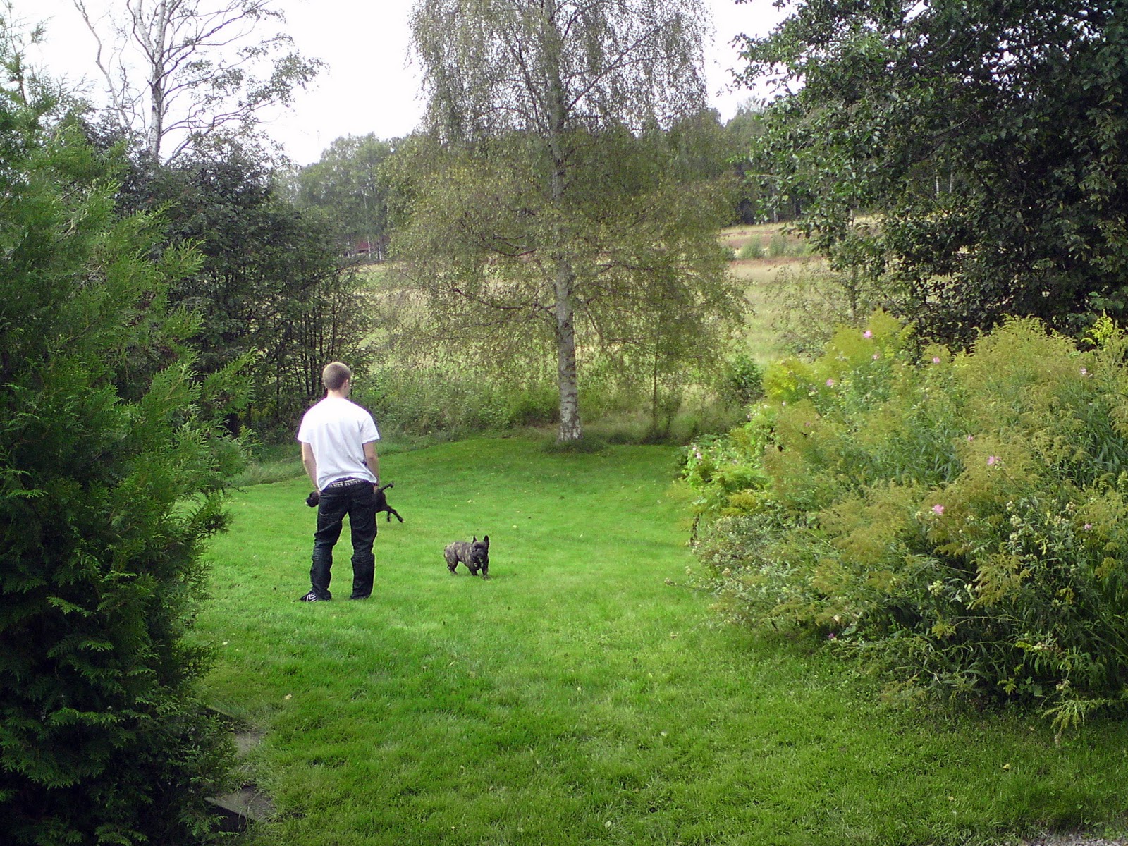 Nu är dom igång igen. Samuel kollar in när dom springer sig trötta på gräsmattan. Härlig utsikt från husets framsida.
