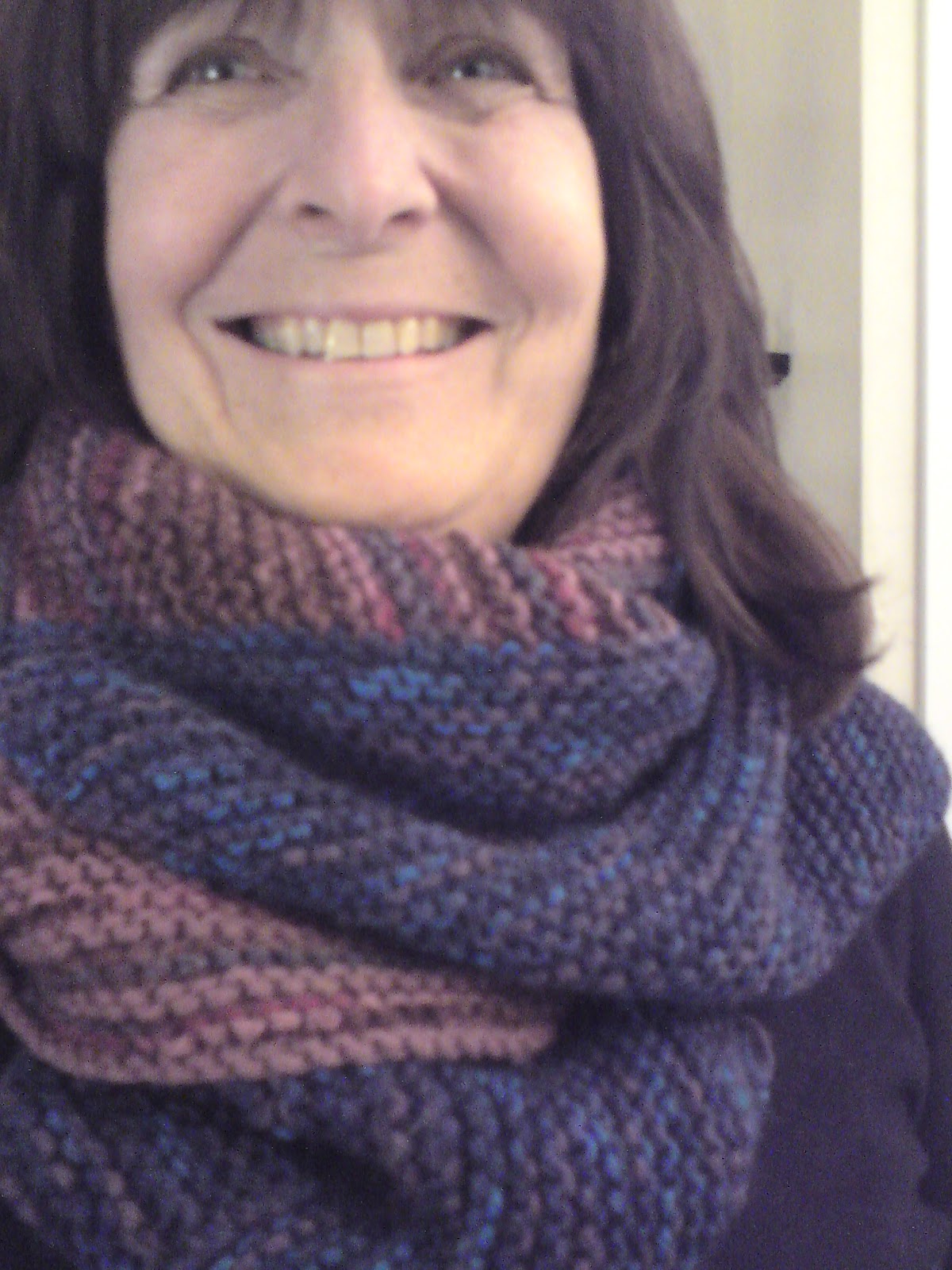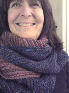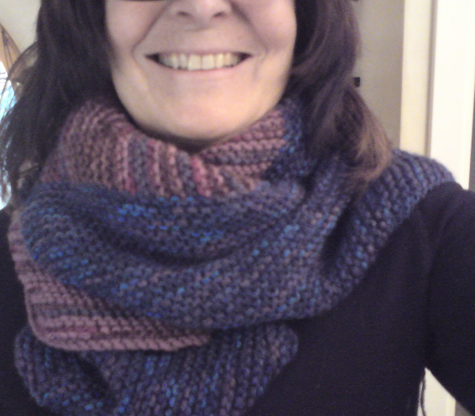 Ja, ni kommer nog inte ens ihåg att jag faktiskt har hållit på och stickat en halsduk, för det var ju ett tag sen jag började. Här hemma går inget med nån större snabbhet kan jag säga, men nu är den i varje fall klar, ska bara fästa några garnändar (ni ser en tråd som hänger där underarmen).