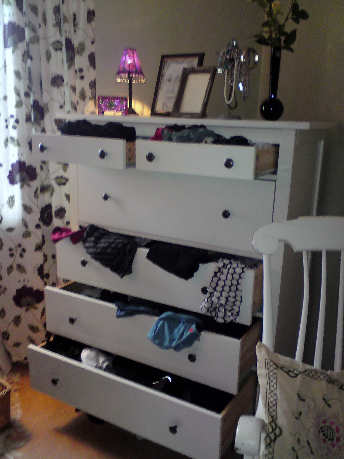 Mitt veckoprojekt i "rensa-i-röran" är inte tillnärmelsevis (heter det så?) så gigantiskt som förra veckans. Men jag fortsätter på klädtemat och nu blir det rens i byrålådorna som rymmer trosor, bh-ar, linnen, t-shirts, strumpor mm...vi får se vad jag hittar.